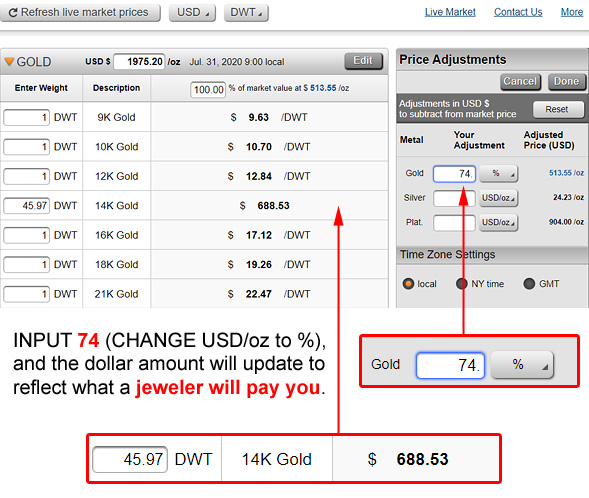 A simpler way, is to just use Kitco’s gold calculator and input 74% into the PRICE ADJUSTMENTS widget. That gets you real darn close to what you can sell your jewelry for: